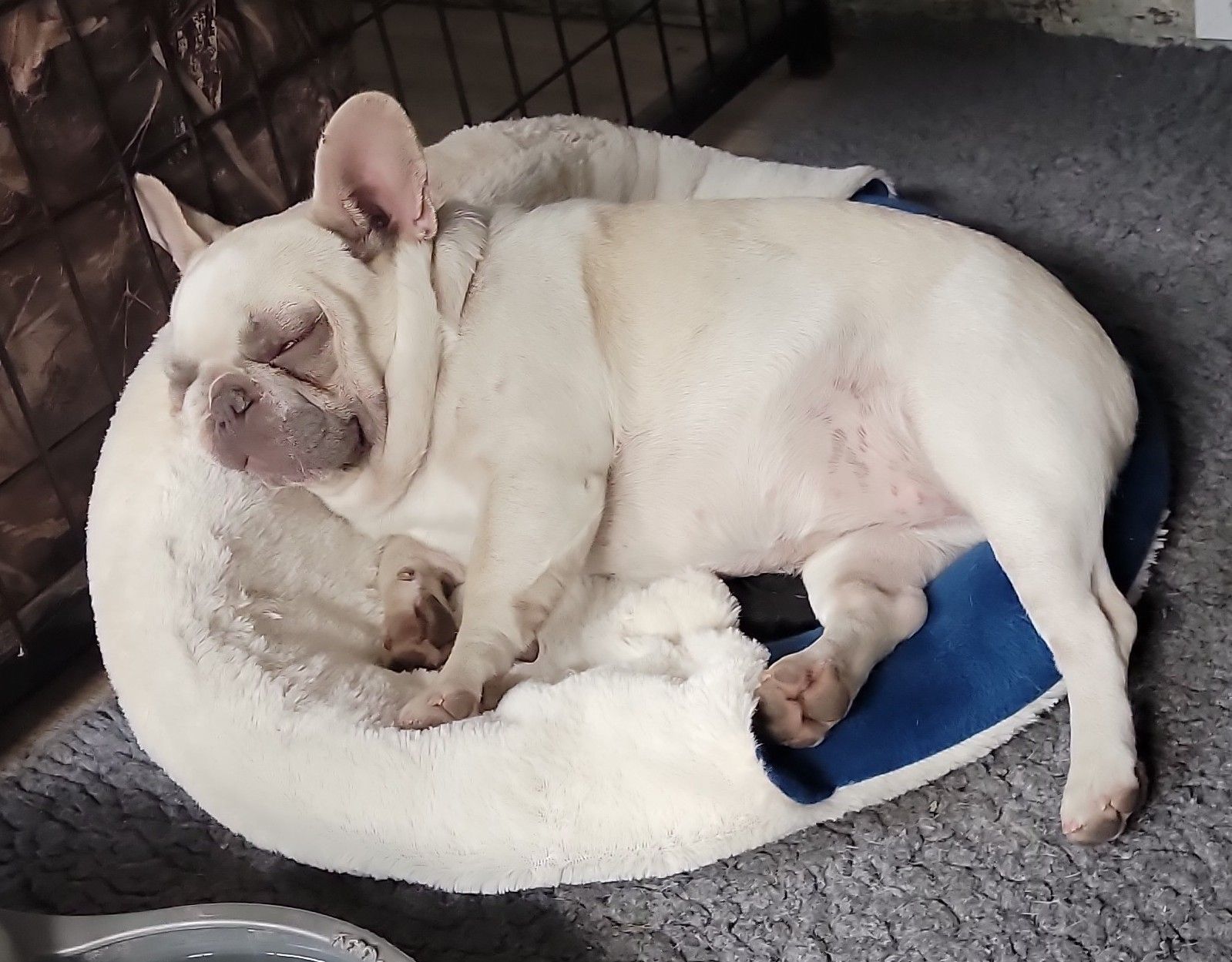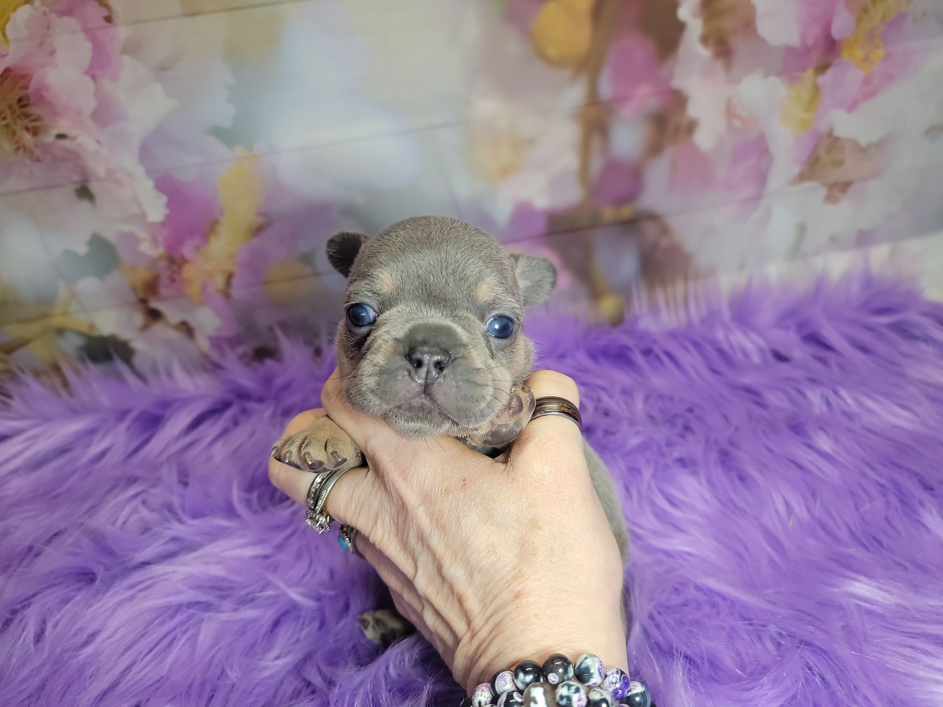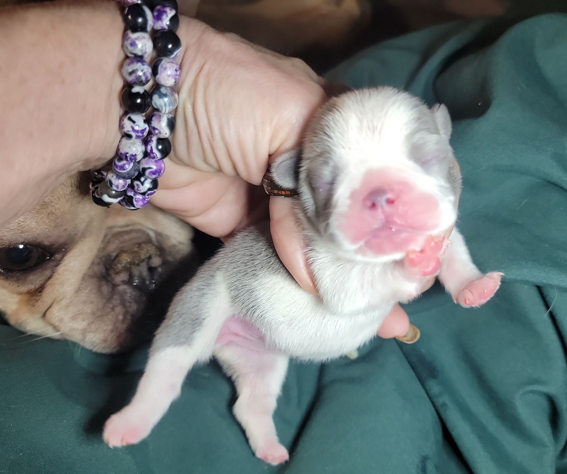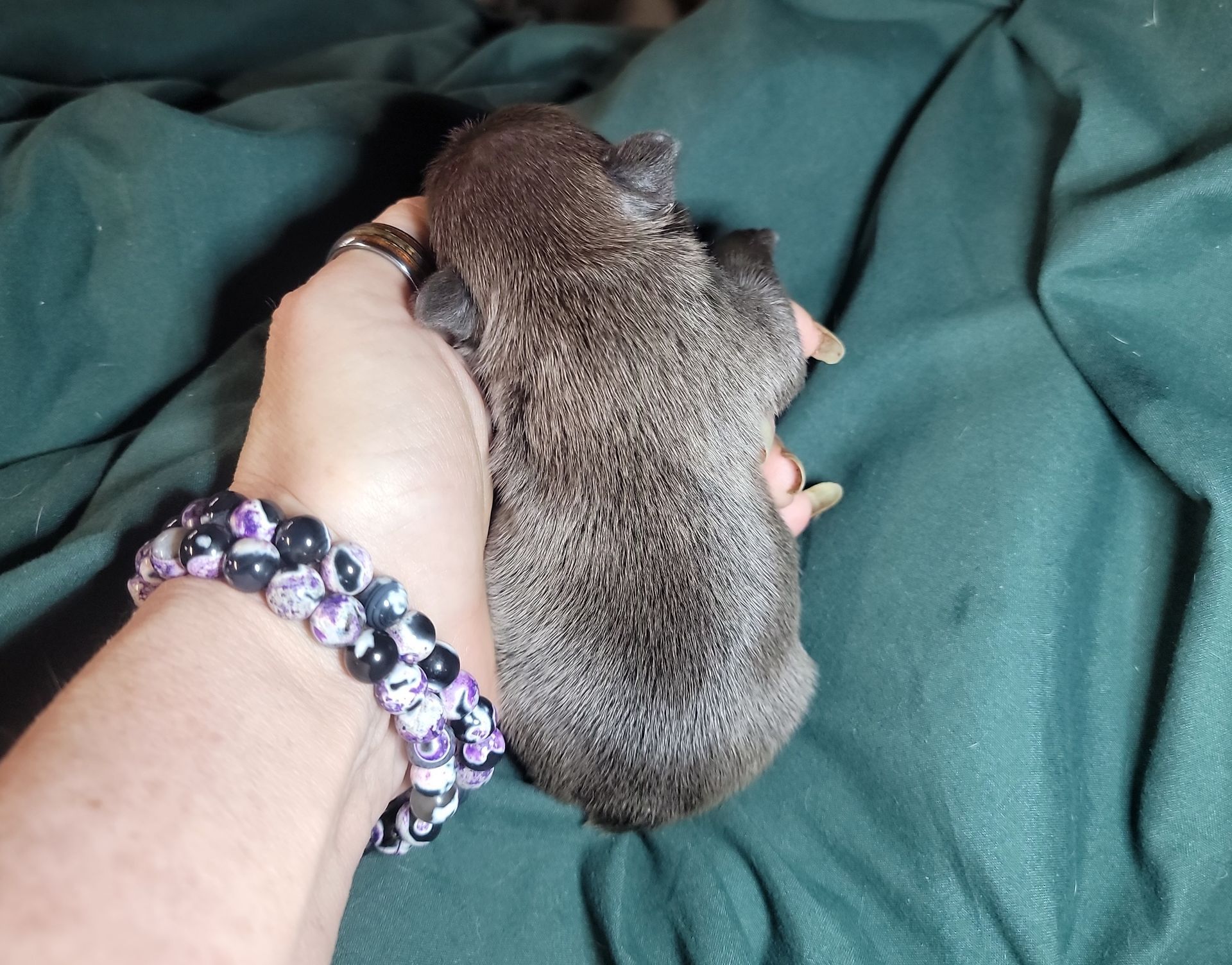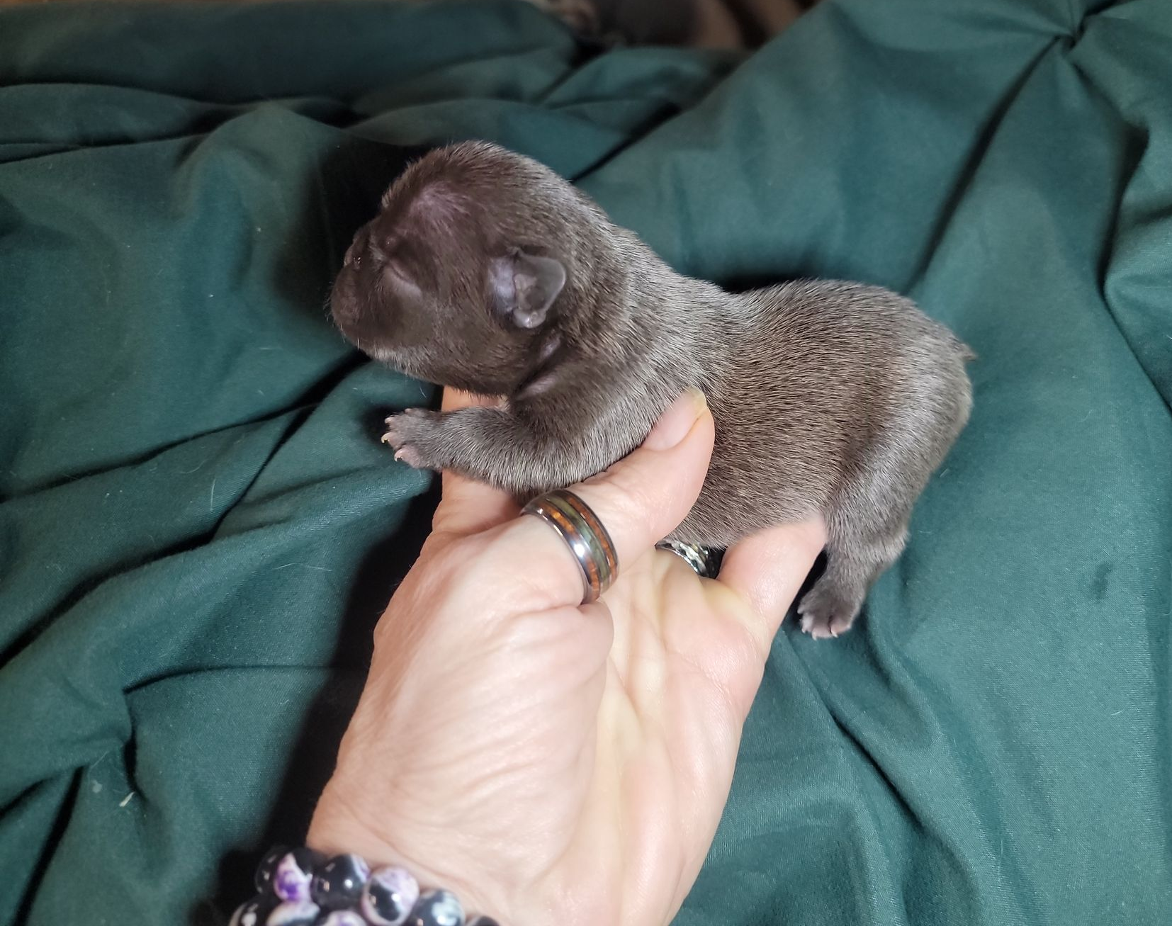 Pictured are same aged Mini, Pocket and Itty-Bitty Pocket. Also, Mini snuggling with Itty-Bitty Pocket in sleep. You'll find my minis are standard prices, comparable to other breeders breeding huge Frenchies. This is because they don't require any different care than larger Frenchies. If you're looking for something rare that nobody else has, then you're looking for the rare Frenchies you can't find anywhere else. I charge more for them because of the extra care they require, special equipment I had to invent to raise them, and because I keep them until they weigh two pounds, usually 3-4 months of age. I also send them home with a New Puppy Kit with all their daily supplement, Blueberry Shampoo and items to treat loose stools. You can upgrade this FREE kit to a big BullyBaum Daily Care & Emergency Kit which has all their Daily Supplements, Grooming Supplies and Everything to treat any Emergency that could come up in the lifetime of your Frenchie, including several things to treat things vet can't or have low success rate of curing like IVDD injuries, viruses, and deadly aspirated pneumonia which can strike quickly at any age. It's reassuring to have on hand everything to treat emergencies when every minute counts. If you are looking for a 30 pound regular Frenchie, there are hundreds if not thousands of breeders you can get one from. If you're looking for a Homeopathic, longer lived, healthier, rare sized Frenchie, then you've come to the right place. Purebred Itty-Bitty Pockets (under 8 pnds) are my newest size and only five of them alive to date. 2024 will be the first time they will be available to the public. I've been breeding for over 20 years, so the majority of my pups go to repeat buyers or those with deposits on my waiting list, but some become available so keep an eye on this page during litters. Financing now available and prices start at $4k for standard colored minis, and I also have buy now pay later. Long time followers and Holistic Dog Frenchie owners on their RareMiniFrenchBulldogPuppies Facebook page are very nice, and happy to talk about HDFrenchies, you're welcome to talk to anyone you want to. I suggest looking for the "Top Fan" badge to find owners or long time followers to befriend. Welcome, have a look around. You can text, phone or email if interested in one of the available pups.